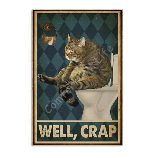 Vintage Restroom Well Crap Cat Poster Art Print Decor for Home Shop Funny Metal Tin Sign Wall Decor Man Cave Retro Metal Signs